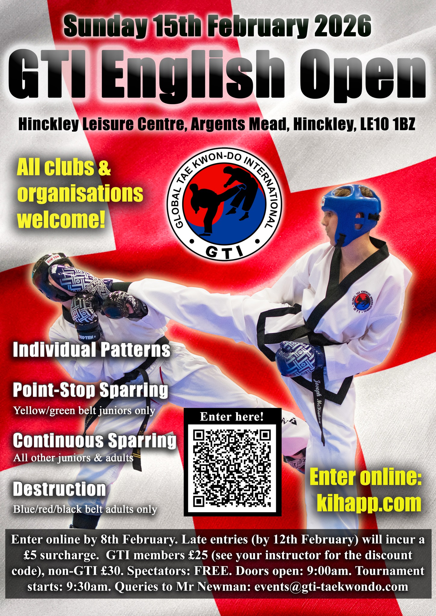 Sunday 15th February: GTI English Open Venue Hinckley Leisure Centre, Argents Mead, Hinckley, LE10 1BZ Start time Doors open 09:00. Tournament starts 09:30. Entry fee Β£25 for GTI members; Β£30 for non-GTI. Spectators FREE! Eligibility Open to all licenced students graded 9th kup (yellow stripe) and above Events Patterns Point stop sparring for yellow/green […]